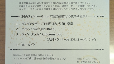 朝より市役所へ。まずは議場コンサート。岡山フィルハーモニック管弦楽団の演奏を市民の皆さんと聞かせて頂き、感動!2回目が実現できたことも嬉しいです。 その後、2月議会初日へ。令和8年度予算など市長より...