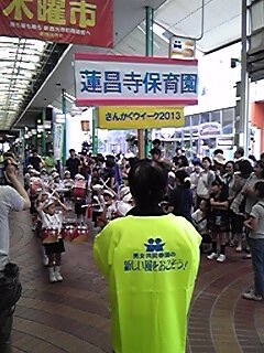 その後、市民文教委員長としての初めてのイベント(さんかくウィーク2013オープニングセレモニー)でのあいさつへ。若草・蓮昌寺保育園園児による演奏パレードがあり、元気と勇気をもらいました。