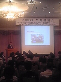 その後、母校明治大学の校友会岡山県支部の役員会。終了後、講演会。講師はザックジャパンの長友選手の恩師明治大学サッカー部の神川監督で、演題「サッカーを通した人作り、組織作り」でしたが、リーダーとしての理論を教わりました。