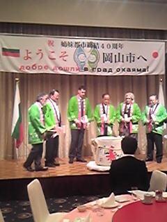 岡山に帰り、姉妹都市であるブルガリアのプロヴディフ市訪問団の歓迎夕食会へ。市長・副議長・幹部職員など多くの方々と一緒に、(通訳を交え)会話と料理を楽しみましたが、このような会ではいつも「英語が話せたら・・・」と思います。