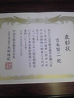 途中、表彰式へ。議員在職、8年より表彰を受けました。ただ、岡山市政の発展のためにどれだけ自分がやれているかはわかりませんが、今回の表彰を頂いたことより今以上に頑張るしかありません。