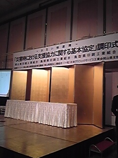 その後、調印式へ。鳥取県・島根県・岡山県印刷組合の災害時における支援協力を結びました。家庭や地域では災害時に備えていますが、会社やその業界で備えることも必要です。これからもこのような支援協力の輪が拡がることを願います。