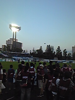 夜は地域の皆さんとファジアーノ岡山の応援へ。ファジアーノ岡山よりご招待を受け、御野学区と津島福居町内会の皆さん(約100名)で選手の練習をフィールドのそばで見させて頂き大迫力!また結果は、約8100名のサポーターで応援し、後半ロスタイムのゴールで勝利!