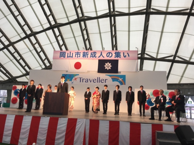 その後、新成人の集いへ。あいにくの雨ですが、振袖・袴などを着た新成人が集まり盛大に開催されました。これからの岡山市・日本を背負って立つ皆さんです。輝かしい未来に向けて頑張って頂きたいと思います。