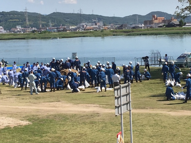 朝より岡山市水防訓練へ。旭川の氾濫を想定して、地元の皆さんも含め多くの方が参加して訓練を実施。皆さん、素早く土のうを作っておられました。