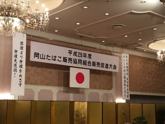 その後、販売促進大会へ。岡山たばこ販売組合さんが一年に1回開催される大会です。岡山市に約50億円のたばこ税が入っています。これからも『分煙先進都市』を目指します。