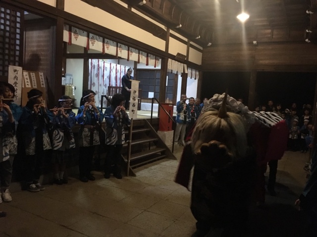 夜はお祭りへ。尾針神社の秋祭りで、各町内よりだんじりが集まり、拝んで頂きました。また、ひとつの町内会が獅子舞を披露。練習の成果が発揮された、素晴らしい舞でした!