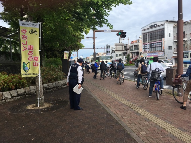 朝よりチラシ配り。この時期は新入生も慣れてきて、交通事故が多くなる時期です。伊島、御野、津島学区・警察・大学・岡山市などの関係者で、国道53号線交差点で自転車の安全運転啓発のチラシを配りました。車の渋滞よりも、自転車の交差点での混乱の方が、明らかに危険です。時価帯は限られていますが、対策は必要です。