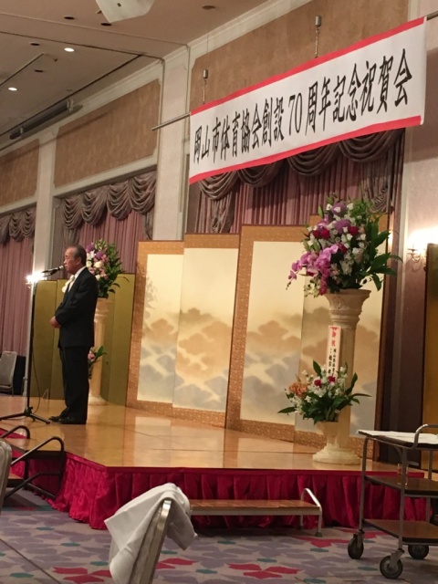 その後、懇親会へ。岡山市体育協会創設70周年記念で多くの関係者が参加され盛大に開催されました。日頃より、ボランティアで岡山市のスポーツの発展のためにご尽力を頂いている団体であり、皆さんです。数年前に一般財団法人となり、組織強化もでき、産官学の連携も出来ています。今まで、影ながら法人化や人事などにおいて関わらせて頂きました。今後の益々の発展を期待します。