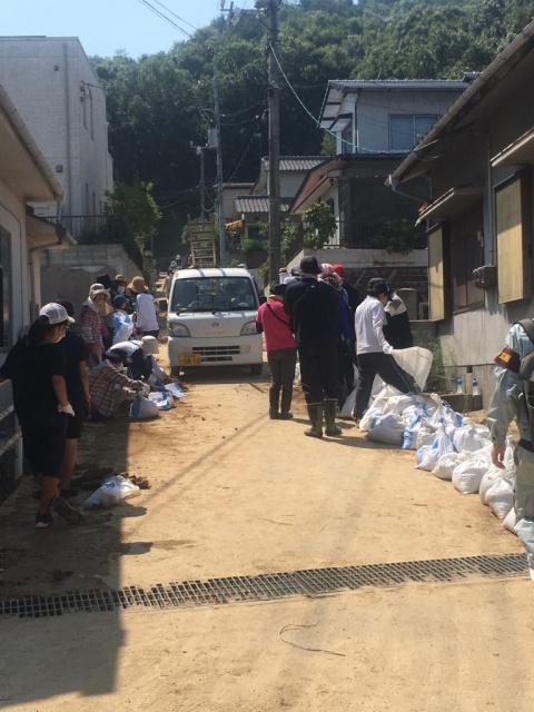 その後、被災現場へ。町内でがけ崩れがあり、その清掃ですが、炎天下の中、町内の皆さんと21名のボランティアで約100名で作業を行いました。この光景を見て、地域の団結力と助け合いの姿に感動!!この地域の大イベントに少しですが協力出来たことに感激!!!