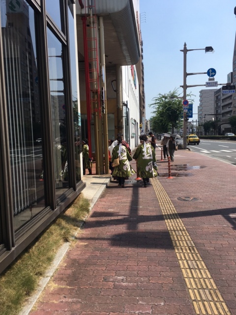 2018年08月04日(土) 活動日記 うらじゃ&作品発表会 別の演舞場に移動している時。前を歩いているこの蓮(蓮雫)の皆さんは、たばこなどのゴミを拾いながら次の会場へ移動。素晴らしい心意気の踊り蓮の皆さんで、このような行動には頭が下がります。