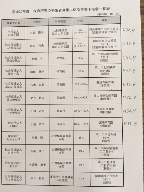 2018年11月02日(金) 活動日記 新しい受け皿 朝より市民宅へ。世間話をしたりしながら、選挙の話。いろいろお世話になります。その後、市役所へ。やることは沢山あります。そのひとつが保育園の受け皿増の報告です。今年も350人以上の未入園児の新しい受け入れ枠を認定しました。平成32年・33年のオープンとなりますが、これで待機児童が減って欲しい・・・。夜は会合へ。地域の皆さんのためにご尽力を頂いている皆さんには頭が下がります。