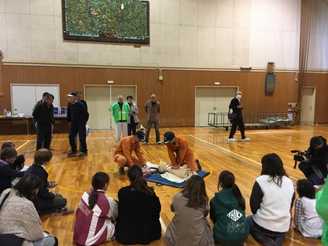 その後、防災フェスタへ。伊島学区の皆さんが初めて開催されたイベントですが、7月豪雨災害のため防災意識が強くなったこともあり、小学生・大学生・高齢の方まで約100名の方が参加。家庭用災害警報器や救急車の年間3万件を超える出動の話、地震災害のDVD鑑賞、AED・人工呼吸・消火体験など。地域の役員の皆さんや岡山市消防局のおかげで、良い体験が出来ました。