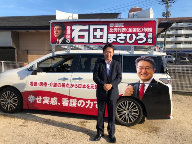 夕方より選挙応援。我々議員は全国区比例の参議院議員候補者の割り当てがあり、今夜は看護関係の石田まさひろ候補の選挙カーが来ましたので、応援へ。『1枚目の投票用紙には、石井まさひろ。2枚目の投票用紙には、石田まさひろ』とマイクを握り連呼!関係候補には、皆さん当選して欲しいです。