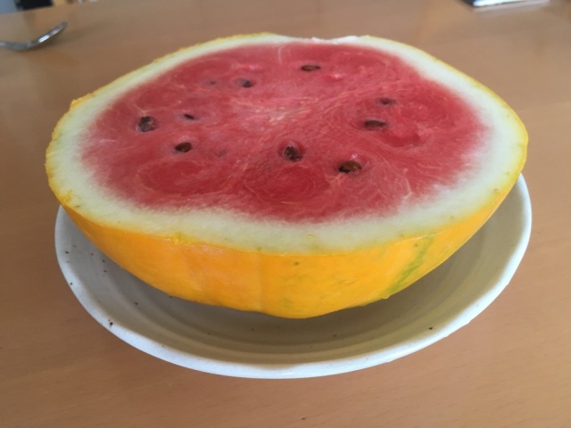 その後、先日頂いたゴールドスイカ(仮称)を試食。切ってみると、中は赤。普通に美味しかった!