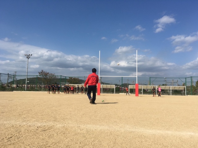 途中、JR北長瀬駅周辺の多目的広場へ。この度、関係者のご尽力より、ラグビーポールが設置され、初蹴り(プレースキック)をさせて頂き、成功(?)・・・!その後、中学生選手が初練習を開催。この中からラグビーワールドカップで活躍する選手が出ることを祈ります。