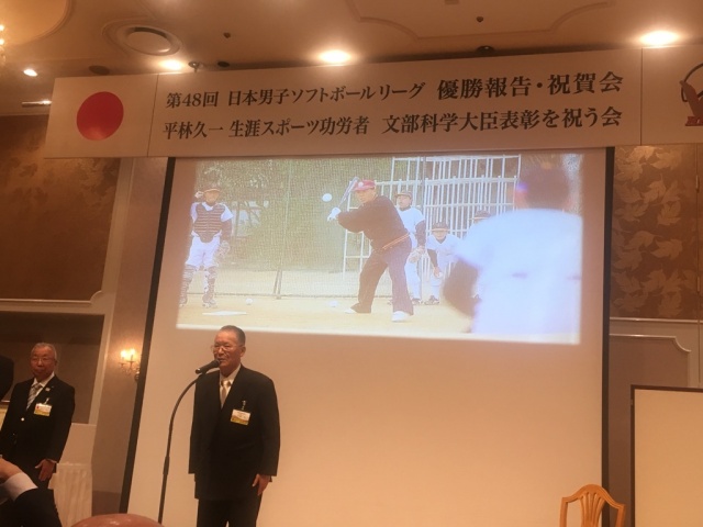 夜は祝賀会へ。平林金属会長の平林久一氏の生涯スポーツ功労者文部科学大臣表彰と平林金属男子ソフトボール部の日本男子ソフトボールリーグ優勝をお祝いする会が、約700人の方を集め、盛大に開催されました。久一氏は半世紀以上スポーツ少年団指導者として、青少年健全育成にご尽力を頂いており、我々のレジェンドであることは間違いありません。これからもお元気で頑張って頂きたいです。