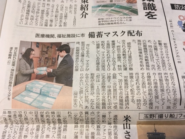 朝刊に記事が。市長へ2回提案してやっと実現。施設はマスク不足で困っています!関係者には感謝です!!