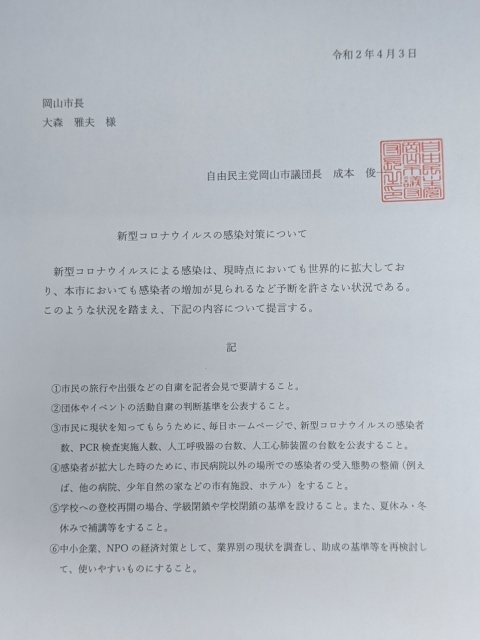 朝より役員会へ。自由民主党岡山市議団として、国や岡山市へ新型コロナウイルスへの対策の要望書を出すことを決めました。
