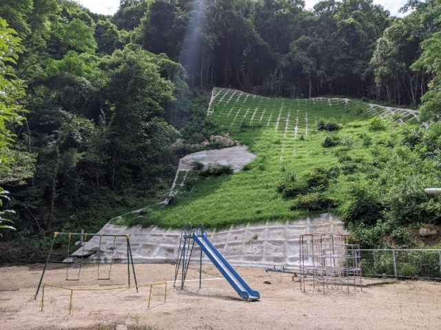その後、被害現場へ。2年前に崩れた遊園地周辺が整地(写真)されていました。良かったです!