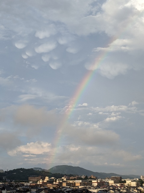 夕方より、集中豪雨。本来であれば、ソフトの練習でしたが、大変な天気に。岡山市災害警戒本部が設置され、また地域の見守りをしていると、我が地域の座主川も水位がギリギリまで。大きな災害は出ていませんが、他都市の被害を報道で見ていますので、本当に心配です。ただ、久しぶりに虹を見て、ホッと!