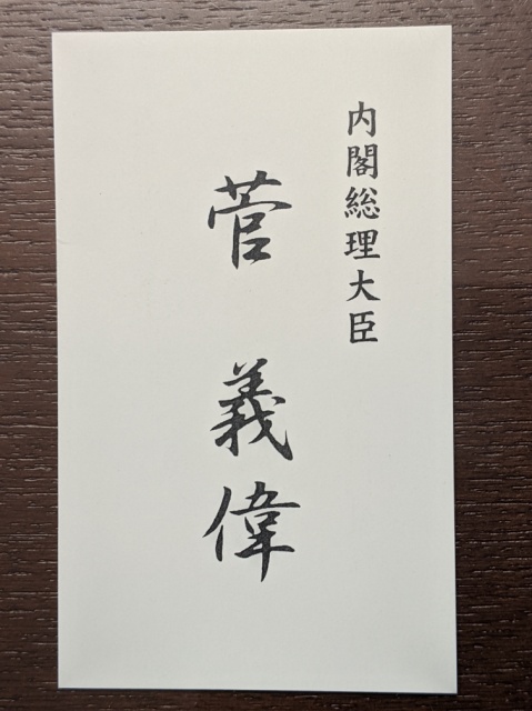 菅内閣総理大臣より挨拶のお手紙を頂き、名刺が入っていました。かなりビックリです!