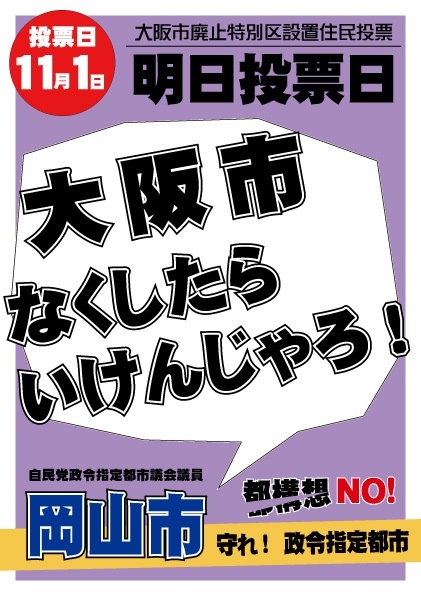 大阪都構想の応援に同志の議員が行っており、全国政令指定都市の自民党市議団が集結して『反対』の応援です。1日が投票日です・・・。