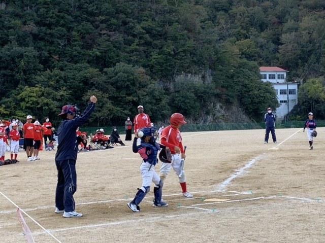 何かの巡り合わせで、決勝戦の主審をすることに・・・。固定ホームベースが外れるアクシデントもあり、難しいジャッジもありましたが、無事に終了。優勝した牧石スポーツ少年団の皆さん、おめでとうございました!!