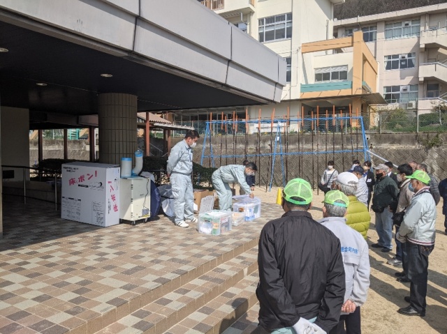 その後、避難訓練活動へ。岡山市職員さんより、自主防災会の皆さんや学校・公民館関係者と一緒に防災グッズや避難所の説明など受けました。『使わないこと』を祈りますが、準備は必要です!