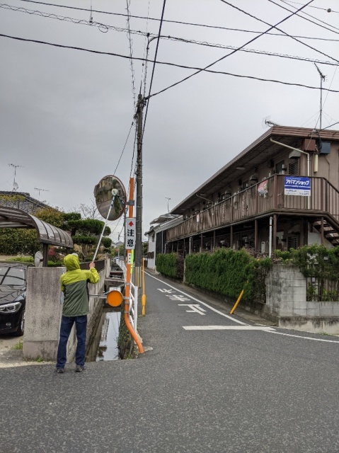 その後、清掃へ。始めるころに雨が。それでも地域の皆さんとカーブミラーの清掃です。雨の中でしたが、綺麗になりました。お疲れ様でした。