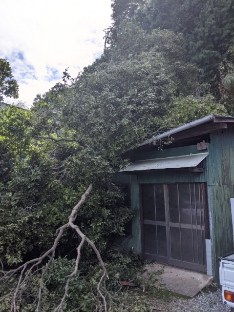 その後、連絡があった現場へ。深夜の大雨のため、倒木が倉庫に直撃しました。まずはケガ人が出なかったことにひと安心。倉庫に直撃し屋根は破損しましたが、中の道具等は傷んでいません。しかし、これからが大変です・・・。