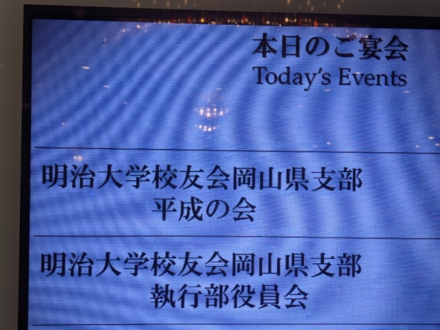 その後、会合へ。年に1回の『明治大学校友会岡山県支部 平成の会』の集まりを行い、先輩方と来年の『明治大学全国校友岡山大会』について意見交換。有意義な時間となりました。最後は全員で校歌を斉唱!気持ちが良かった!!