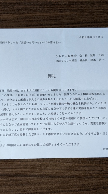 2022年08月23日(火) 活動日記 うれしい手紙 まずは早朝練習。蒸し暑かった〜。でも子どもは元気です。その後、資料作成。代表質問原稿修正などやることはたくさんあります。その後、市民宅を訪問。選挙や9月議会の補正予算について意見交換をさせて頂きました。うれしい手紙が届きました。こちらとしては、このような初企画(出前うらじゃ)を立ててくれたことに感謝です!