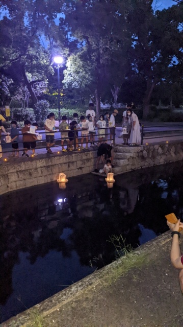 2022年08月27日(土) 活動日記 灯ろう流し 朝より作業。やることはたくさんあります。その後、ソフトの練習へ。日中は暑い!でも子ども達は今日も元気。夕方より、キャンドルナイト・灯ろう流しin『観音寺用水 緑と水の道』へ。3年ぶりに京山民謡クラブの皆さんの踊りを見させて頂きました。子ども達もいろいろな想いを持ちながら灯ろう流しを。夏休みの良い想い出が出来たはずです。『緑と水の道』は岡山でESD世界会議が開催されたことを記念して造りました。あの頃を思い出します。
