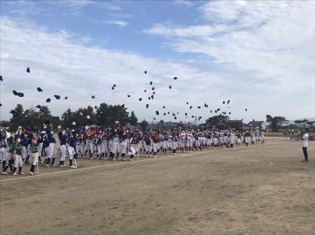 2022年09月24日(土) 活動日記 スマイルカップ 朝より部長会議。10月開催の5年生北ブロック予選会や秋季錬成大会の運営などの打ち合わせ。皆さん、お疲れ様でした。その後、岡山南高等学校野球部OB主催の『スマイルカップ』へ。開会式ではキャップを天に投げたり、優勝チームにはスマイルTシャツを渡したり、と大人では考えないことを若者はやります。また、同級生など約30人がボランティアで、準備やボールボーイやトンボ掛けや後片付けまで。若者たちのすべての行動に感動!素晴らしい若者たちでした!!