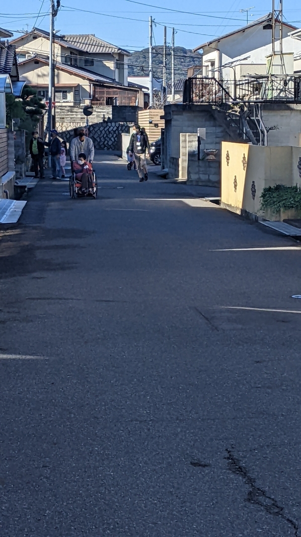 途中、避難訓練へ。近所の皆さんが要支援者を車いすに乗せ、一次避難所(公会堂)まで連れていきます。また、班の皆さんが回覧板を回すように、お互いに順番に声掛けを実施し、公会堂へ。自助・共助を確認しながら、最後は反省会。見させて頂いているだけで、非常に勉強になりました。