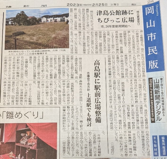 2023年02月25日(土) 活動日記 施設開放委員会 朝刊に、長年の地元活動で実現した『ちびっこ広場』の記事が。令和6年完成ですが、皆さん喜ぶでしょう! 朝より市民宅へ。地域の道路整備の相談です。 その後、施設開放委員会へ。来年度の利用予定などを確認。 その後、企業訪問。業界や選挙の話などで意見交換。