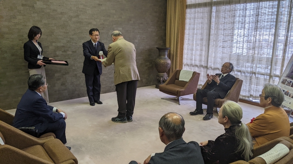 その後、感謝状贈呈式へ。岡山市よりたばこ販売協同組合の皆さんへ、たばこ税約50億円への貢献に対し、感謝状を贈りました。