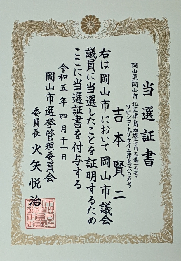 2023年04月11日(火) 活動日記 当選証書 朝より資料整理。やることはたくせんあります。 その後、市役所へ。まずは当選証書授与式へ。4年間、全力を尽くします。 その後、議会運営委員会へ。令和5年度市議会テレビ委託業者の審査など。 その後、市民相談の件で担当課と打ち合わせ。難しそうです。