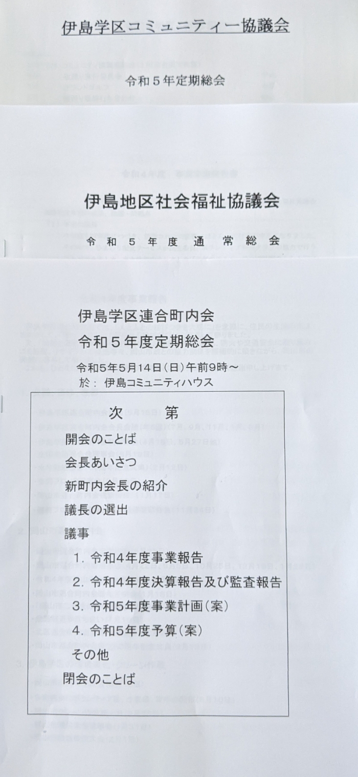 2023年05月14日(日) 活動日記 総会&清掃 朝より総会へ。3団体の総会が開催されました。地域のためのご尽力には感謝しかありません。 その後、地域清掃へ。雨のあとより、草は抜きやすかったけど、ドロは重かった・・・。 その際、地域の相談を多数いただきました。 その後、報告が。全国大会岡山県予選が無事に終了しました。私が顧問をしている岡山少年ソフトボールクラブと岡山リトルエンゼルスは残念ですが、優勝は出来ませんでした。この大会に向けてたくさんの練習をしてきた両チームです。まだまだ可能性を持った子ども達です。次の目標に向けてガンバレ~!