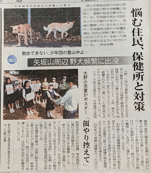 今朝の朝刊に野犬捕獲の記事が。地域の皆さんと岡山市の活動が掲載されました。野犬が捕獲され、人慣れ訓練を受け、譲渡されることを願います。