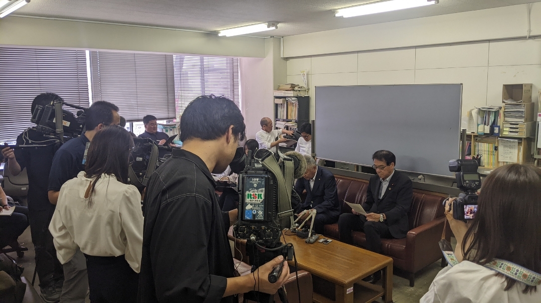 その後、記者会見の見学へ。議長・副議長が岡山県と岡山市の関係改善のために、両議会が党派・派閥別に県議・市議が意見交換することを説明。自民党は6月3日に開催されます。