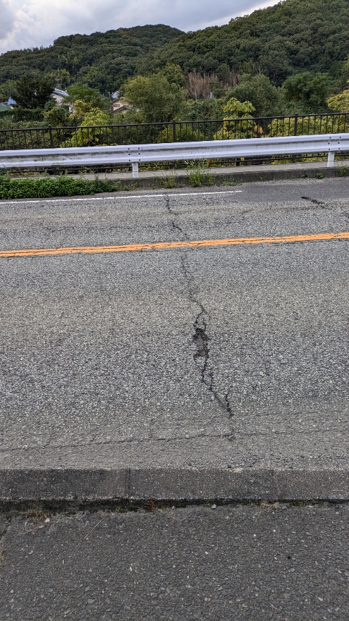 その後、市民相談の現場へ。旧国道53号線ですが、横に割れ目が入っています。事故が起こる前に修繕です。