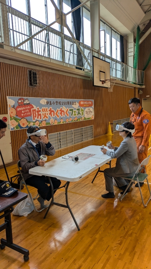 その後、防災わくわくフェスタへ。伊島学区主催で今年が第一回目。消防・警察・中学生・高校生・大学生・各種団体の皆さんの協力で盛大に開催されました。
