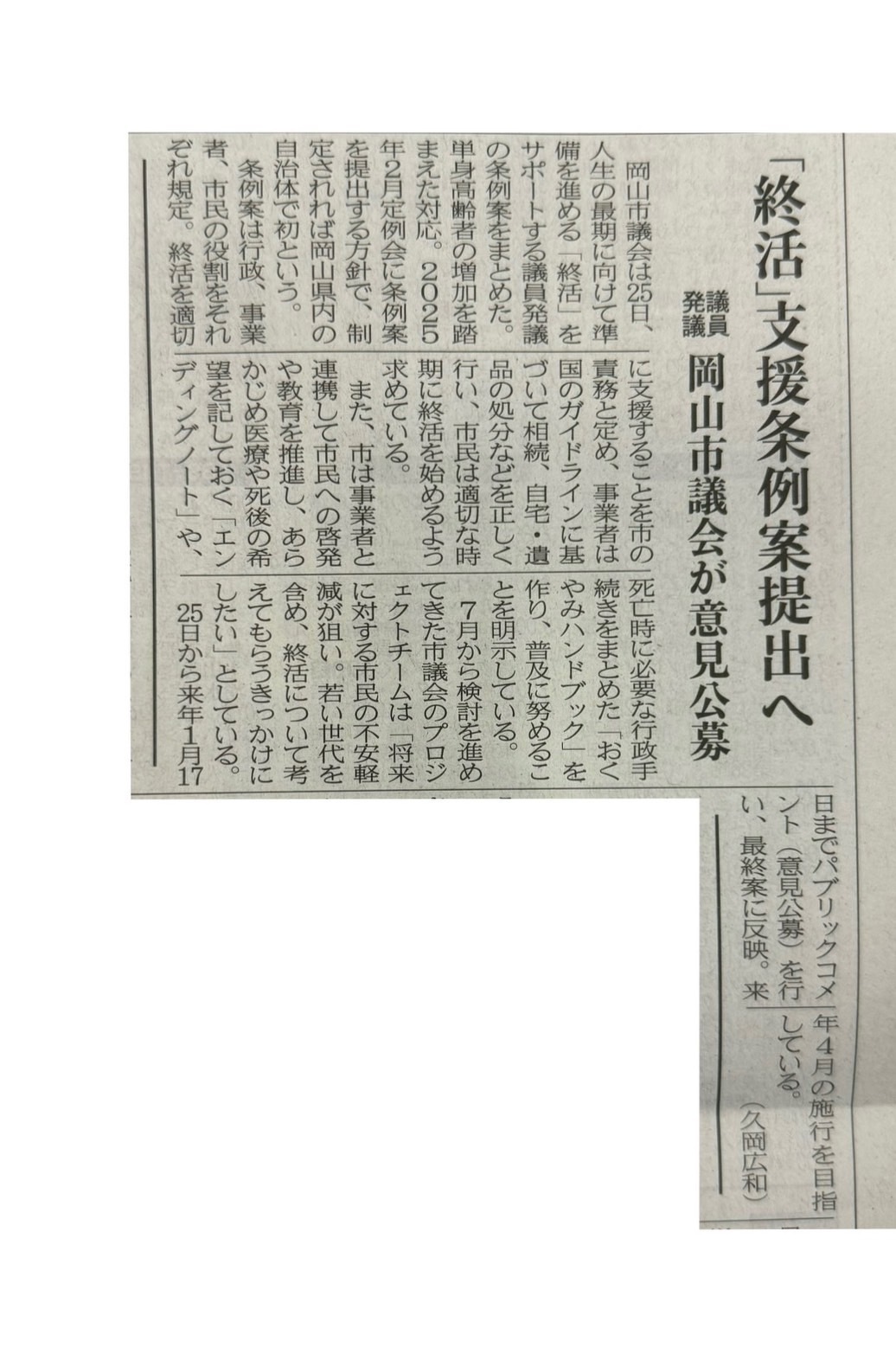 2024年11月26日(火) 活動日記 終活支援条例 朝刊に終活支援条例の記事が掲載されました。プロジェクトメンバーの一人として参加していますので、皆さんご意見をください。 朝より市役所へ。まずは子ども文教委員会へ。11月議会の議案の説明があり、資料請求。 その後、打ち合わせ。11月議会の運営などについて確認など。 その後、会合へ。新しく立ち上げる『スポーツ議連』の世話人会があり、発起人と一人として参加。プロチームの議連はありますが、市民・団体からくるスポーツ関連要望を受ける予定です。