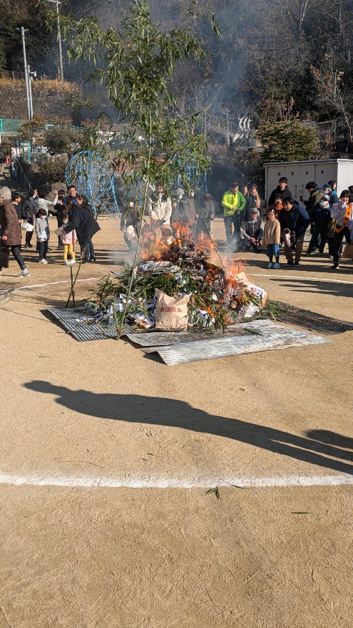 その後、どんど焼きへ。津島小学校PTA主催で地域の皆さんも協力しながら開催。多くの家族が無病息災などを祈りました。