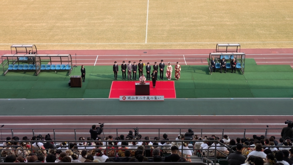 その後、二十歳の集いへ。皆さん、スーツや着物で華やかです。これからの日本を、岡山を背負う皆さんです。夢を持って頑張って欲しいです。