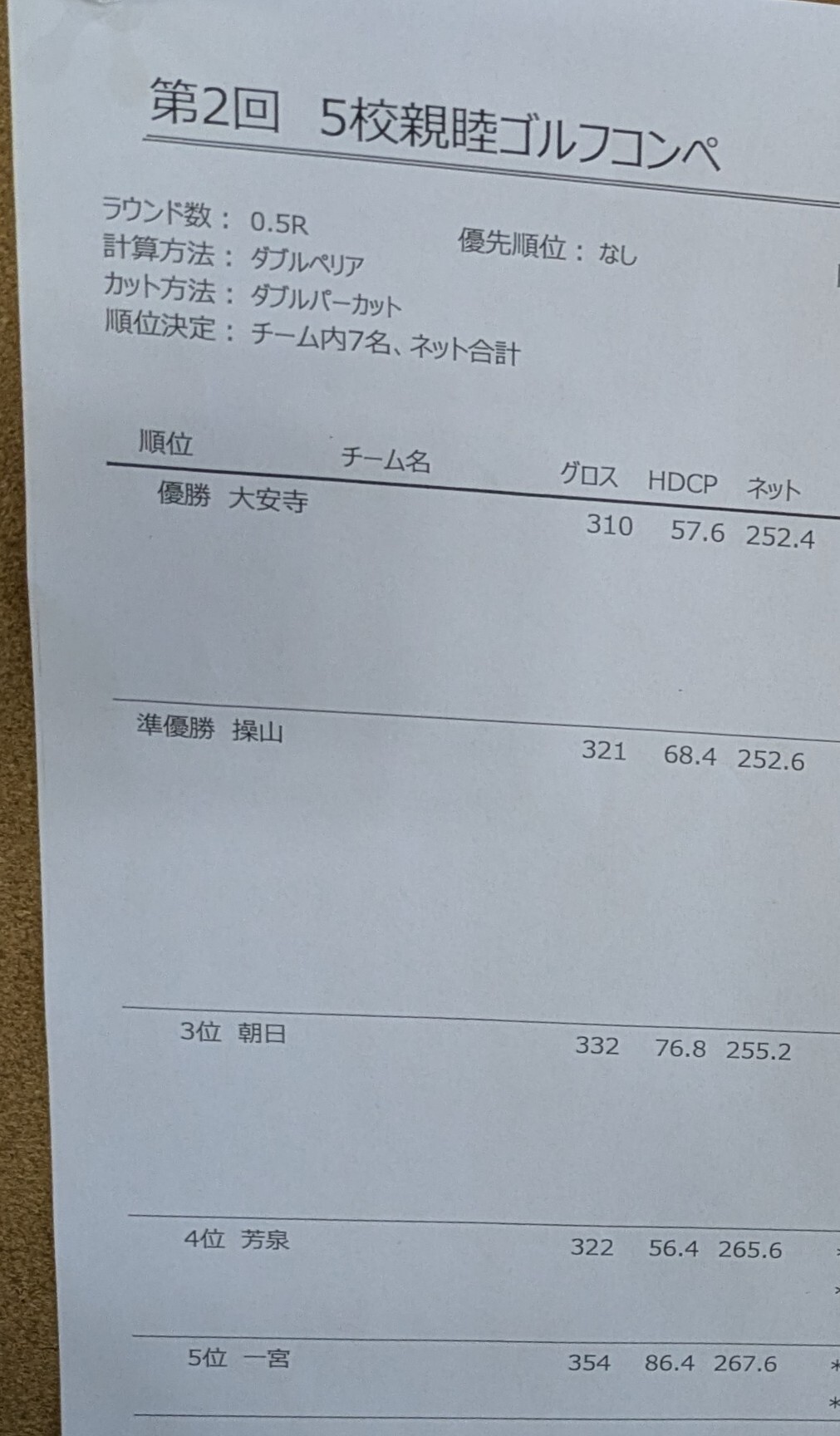 2025年05月15日(木) 活動日記 5校親睦ゴルフコンペ 朝より5校親睦ゴルフコンペへ。合計116人が集まり、母校の名誉をかけて勝負!私も母校岡山一宮高校の先輩・後輩・同級生と一緒に参加しましたが、団体戦では最下位(涙)。来年こそは頑張るぞ!! また、同窓生はもちろん、他校の皆さんとも色々な話ができました。 その後、連絡が。市民相談がいくつか。明日から対応です。 夕方、久しぶりにソフトの練習へ。ピッチング練習の相手をしましたが、みんな頑張っています。