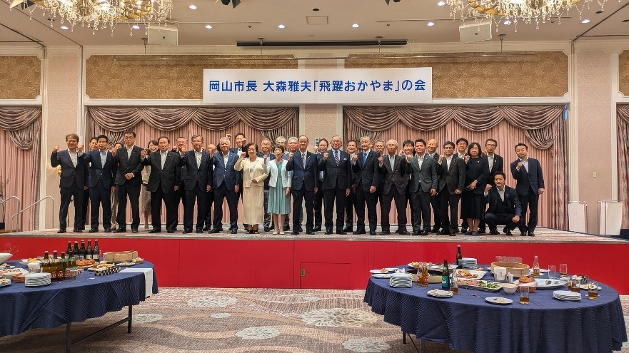 その後、飛躍おかやまの会へ。大森市長を支援する方々が集まり、盛大に開催されました。我々応援する会も立礼などをして、しっかり支援させて頂きました。もう選挙は近いです。
