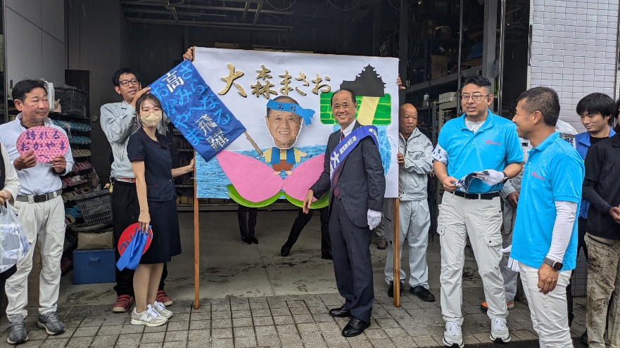 2025年09月25日(木) 活動日記 選挙戦 5日目 朝から雨。選挙戦も5日目。疲れが出るころにこの雨はやはり厳しいです。 午前中は選挙カーに同行。スタッフの皆さんには感謝であり、集まってくれた市民の方々にも感謝です。その内の一か所で、『大森まさお桃太郎』で励ませられ、元気をもらいました。 午後より市役所へ。市民相談を受けた件を担当課に相談。すぐには解決できそうにありません。 夜はいつもの会議へ。本日の結果と明日の確認です。そろそろみんな疲れています。